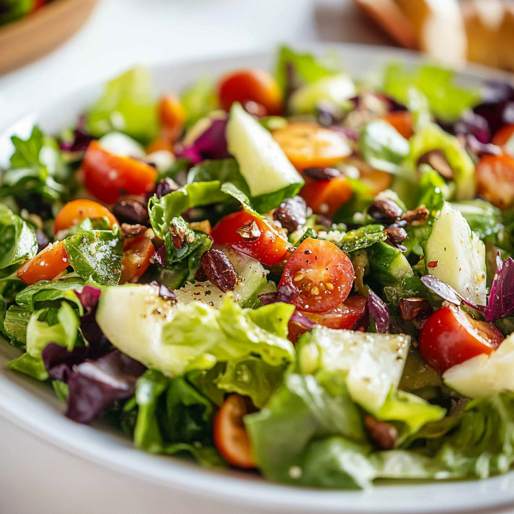Start by washing your greens thoroughly to remove any grit. Chop vegetables uniformly for even texture and presentation. Toss the salad just before serving to prevent sogginess.