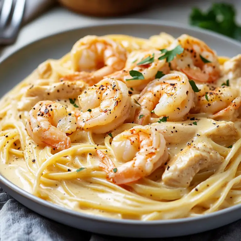 Indulge in the creamy goodness of Chicken and Shrimp Alfredo, a dish that combines tender chicken and succulent shrimp in a rich, velvety sauce. This recipe is perfect for cozy family dinners or impressing guests at special occasions. With its delightful garlic aroma and comforting flavors, it’s bound to become a favorite at your dinner table.
