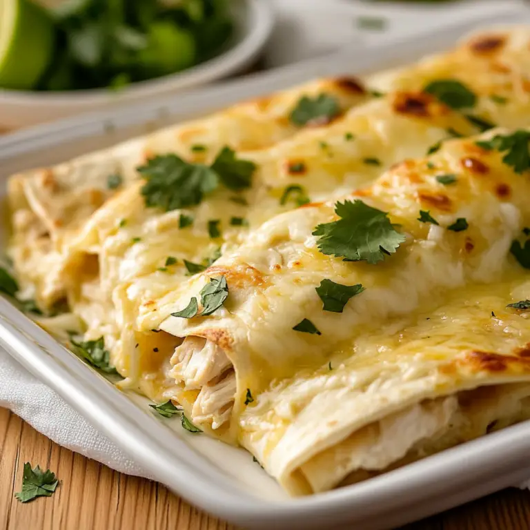 Indulge in the comforting flavors of white chicken enchiladas, featuring tender chicken wrapped in soft tortillas, smothered in a creamy green sauce, and topped with melted cheese. This dish is perfect for cozy family dinners or entertaining friends, delivering warm, savory goodness that will have everyone coming back for seconds.