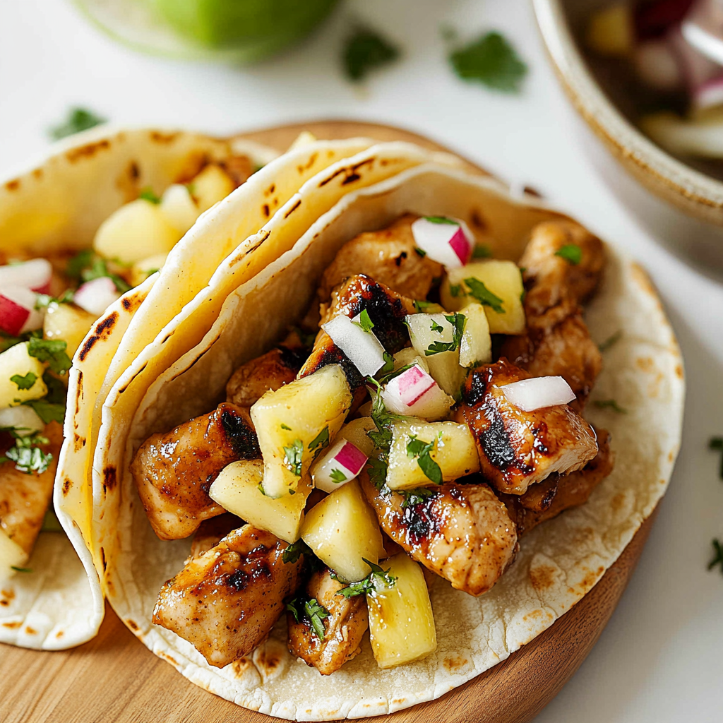 Experience a burst of flavors with these Teriyaki Chicken Tacos! Tender teriyaki chicken is paired with juicy grilled pineapple and a refreshing pear salsa, creating a deliciously vibrant dish perfect for summer barbecues or cozy dinners. Easy to prepare and visually stunning, these tacos are sure to impress your guests and leave them craving more.