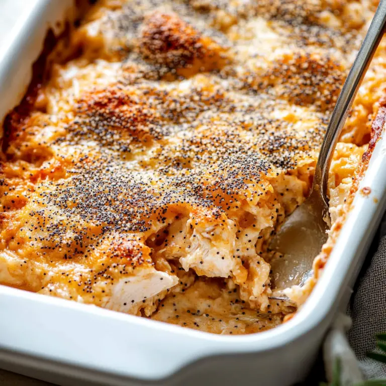 Poppy Seed Chicken Casserole is a heartwarming dish that combines tender chicken in a creamy, savory sauce, topped with crunchy breadcrumbs and poppy seeds. This easy recipe is perfect for busy weeknights or family gatherings, promising comfort and satisfaction in every bite. With its delightful aroma and beautiful presentation, it’s sure to be a hit at your table. Enjoy this dish served hot, alongside steamed vegetables or a fresh salad for a complete meal.