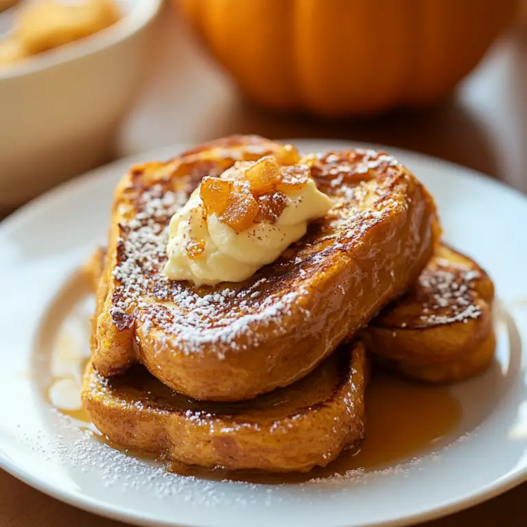 Pumpkin French toast is a warm, cozy breakfast that captures the essence of fall with every bite. Soft slices of brioche or challah are soaked in a creamy pumpkin custard infused with cinnamon and nutmeg, then grilled to golden perfection. Drizzled with real maple syrup and topped with whipped cream, this dish transforms any autumn morning into a delightful feast. Perfect for brunch gatherings or a special treat, this recipe invites everyone to savor the season’s flavors.
