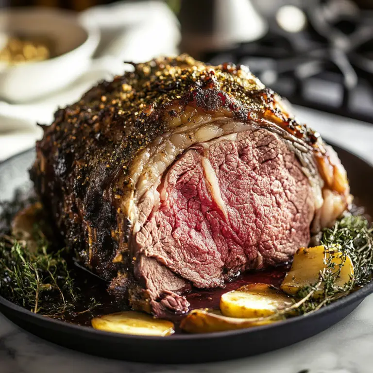 Indulge in the ultimate comfort food with this succulent prime rib roast, featuring a crispy exterior and tender, juicy interior. Perfectly seasoned with garlic and fresh herbs, it’s an impressive centerpiece for any gathering that will leave your family and friends craving more.