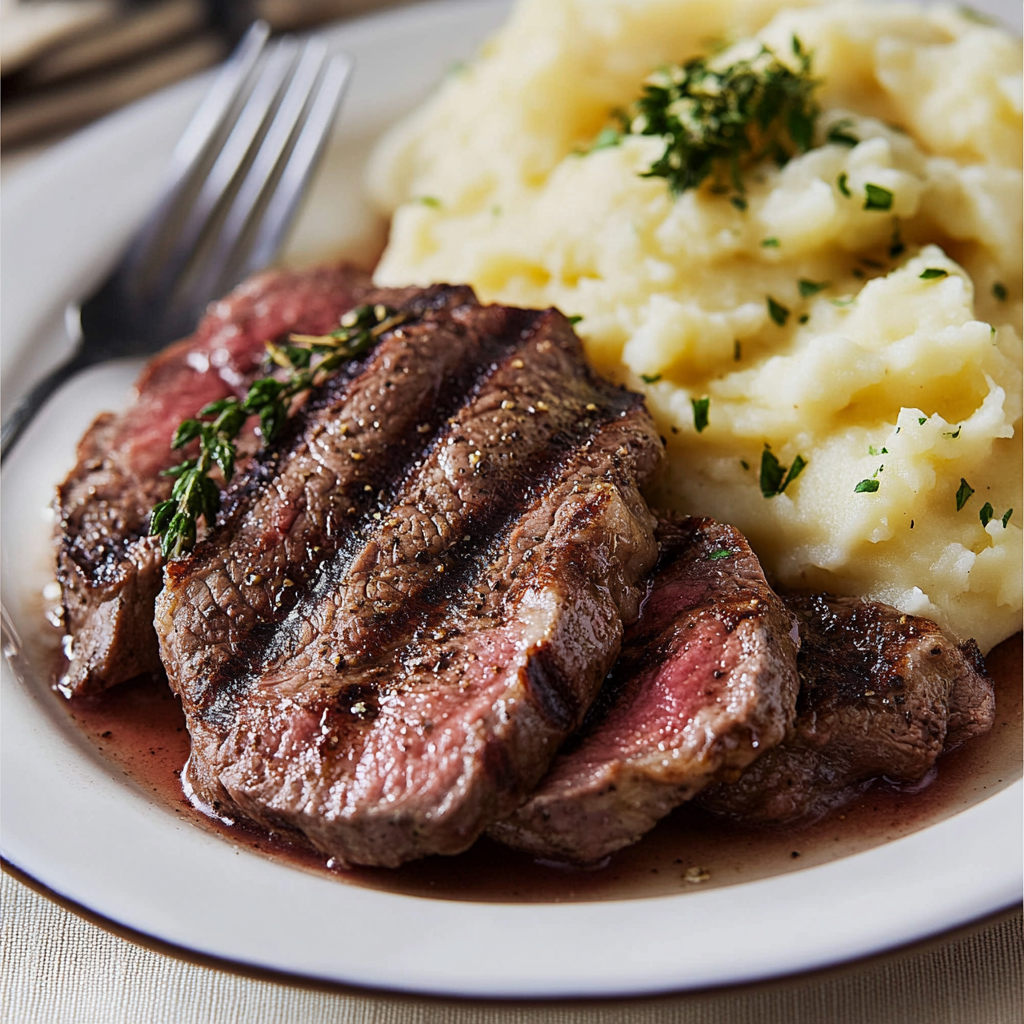 - Let the steak rest for 5 minutes after grilling before slicing. Serve with fluffy mashed potatoes garnished with fresh herbs if desired.