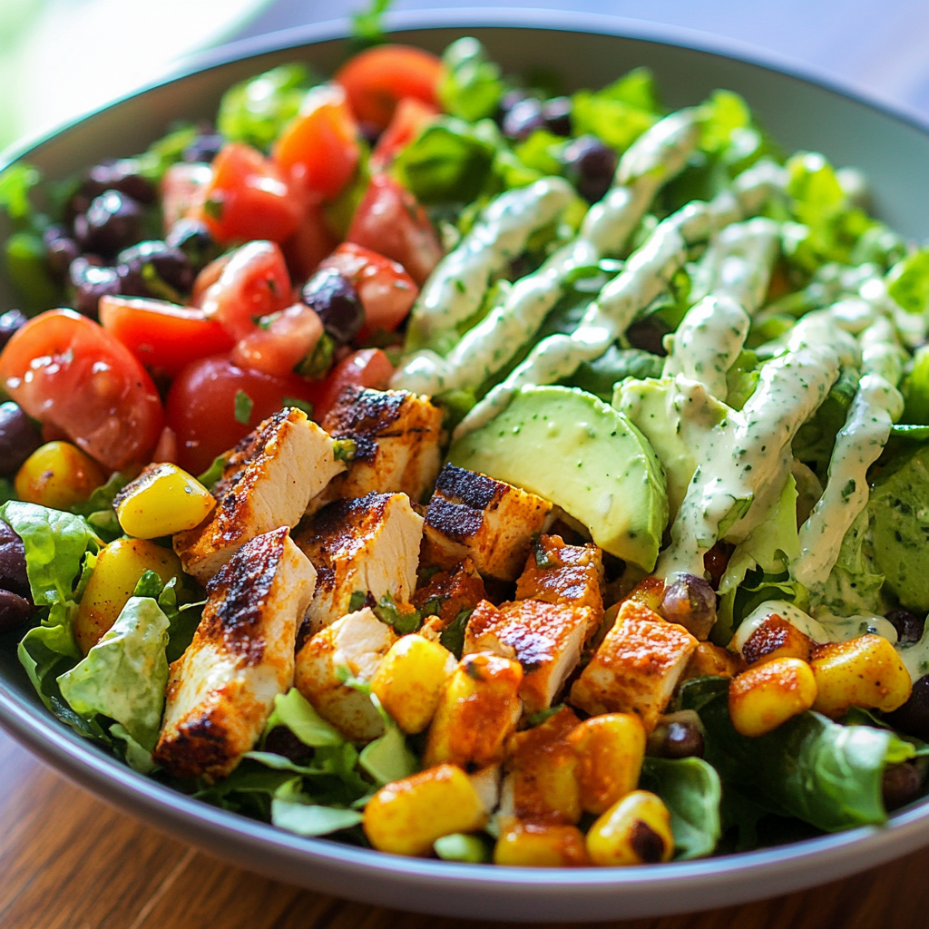 - Combine the Salad: In a large bowl, mix greens, corn, black beans, tomatoes, jalapeños, cilantro, and avocado. Drizzle dressing over the top and toss gently to combine.